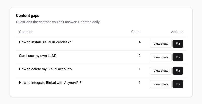 - Content gaps: Discover questions your bot couldn't answer, with AI-powered suggestions for what to add.